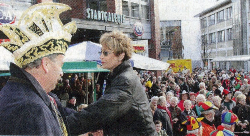 Die Hütchen festgesteckt, das Kostüm wetterfest gemacht, ließen es sich die Langenfelder Jecken nicht nehmen, im Schlepptau des Prinzenclubs das erste „Langenfeld Helau" über den Galerieplatz schallen zu lassen. Zu zünftiger Musik durfte endlich wieder geschunkelt und gebützt werden. Und kurz vor der Sessionseröffnung ließ sich sogar die Sonne blicken. Wenn das kein gutes Omen ist. Einmal eingestimmt geht es nun munter weiter. Für das Prinzenpaar Helga I. und Peter II. brechen nun ein paar wehmütige Stunden an. Sie übergeben am Freitagabend bei der Prinzenproklamation in der Stadthalle das Zepter an Birgit I. und Benno I.